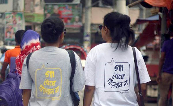 এপ্রিলের শুরু দিকে ঢাকায় একটি টি-শার্টের লেখা সামাজিক মাধ্যমে ব্যাপক আলোচনার জন্ম দিয়েছিল। সেখানে লেখা ছিল - 'গা ঘেঁষে দাঁড়াবেন না'। ঢাকার একটি ইন্টারনেটভিত্তিক নারীদের পোশাক ও অলঙ্কার তৈরির প্রতিষ্ঠান এই ডিজাইনের টি-শার্টটি তৈরি এবং বাজারজাত করা শুরু করেছিল। বাংলাদেশে গণপরিবহনে হয়রানিমূলক ঘটনার প্রতিবাদ হিসেবে এ ধরণের বার্তা টি-শার্টে লেখার চিন্তা মাথায় আসে বলে জানান প্রতিষ্ঠানের স্বত্বাধিকারীদের একজন এবং টি-শার্টের ডিজাইনার জিনাত জাহান নিশা। এই প্রচারণার প্রতিক্রিয়ায় অধিকাংশ মানুষ নেতিবাচক মন্তব্য করলেও অনেকেই এই উদ্যোগকে সাধুবাদ জানিয়েছেন।